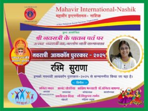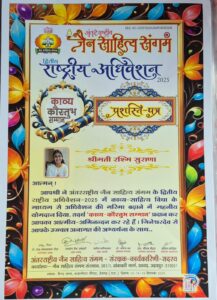 अंतरराष्ट्रीय जैन साहित्य संगम का 13/14 /15 September 2025 का त्रिदिवसीय कार्यक्रम तेरापंथ सभागार मेवाड़ भवन कामलीघाट देवगढ़ में भव्यता से सानन्द सम्पन्न हुआ। देश विदेश के 150 से ज्यादा कवि , सहित्यकार आयोजन में उपस्थित रहे ।रश्मि सुराणा कोलकाता को उनकी सेवाओं के लिये काव्य कौस्तुभ सम्मान से सम्मानित किया गया।