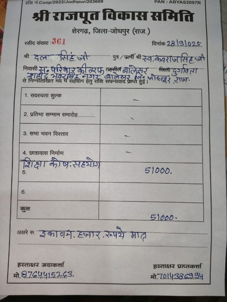 श्री राजपूत विकास समिति शेरगढ के शिक्षाकोष में ₹51,000 का योगदान दिया।