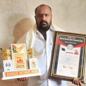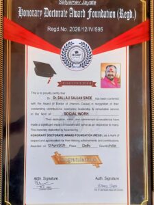 सोलापुर महाराष्ट्र, सोलापुर महाराष्ट्र के बारशी तालूका के ढोराले निवासी एंव एंटी करप्शन बोर्ड (रजि.) के राज्य सचिव बालाजी सज्जन शिंदें जी को दिल्ली में 12 अप्रैल को “होनेरोरी डाक्टरेट अवार्ड फाऊंडेशन” ने उनके सामाजिक कार्यों को देखते हुए होनेरोरी डाक्टरेट अवार्ड से सम्मानित किया गया। इस सम्मान को प्राप्त करने पर अब बालाजी सज्जन शिंदें अपने नाम को डा. बालाजी सज्जन शिंदें लिख सकेंगे। बालाजी सज्जन शिंदें जी ने ये अवार्ड प्राप्त कर सोलापुर जिले का नाम रोशन किया है। उन्हें ये अवार्ड मिलने से पुरे सोलापुर जिले में खुशी का माहौल है।